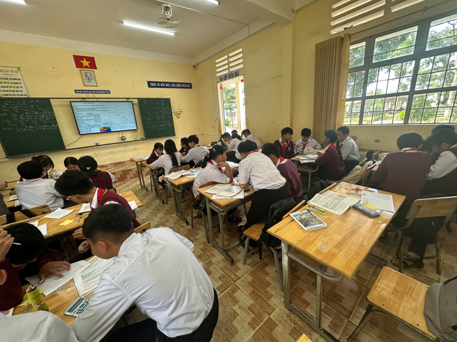 Trong quá trình học, học sinh được chia nhóm để cùng nhau phân tích thông tin, hoàn thành phiếu học tập và trao đổi các cách giải quyết khác nhau. Không khí lớp học diễn ra sôi nổi, học sinh chủ động đặt câu hỏi, thảo luận và hợp tác hiệu quả.